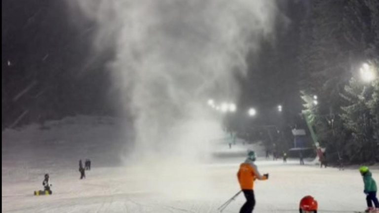 Înregistrarea arată cum coloana de zăpadă antrenată de vânt se ridică de pe pârtie...