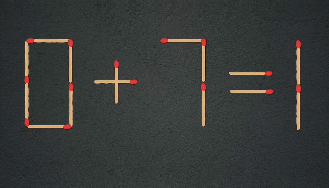 Provocarea pe care o analizăm, 0 + 7 = 1, are o soluție simplă, dar ingenioasă. Soluția constă în mutarea unui băț de chibrit de la semnul plus (+) pentru a transforma cifra 0 într-o cifră 8, astfel corectând ecuația. Aceasta transformare duce la noua ecuație: 8 – 7 = 1, care este corectă.
