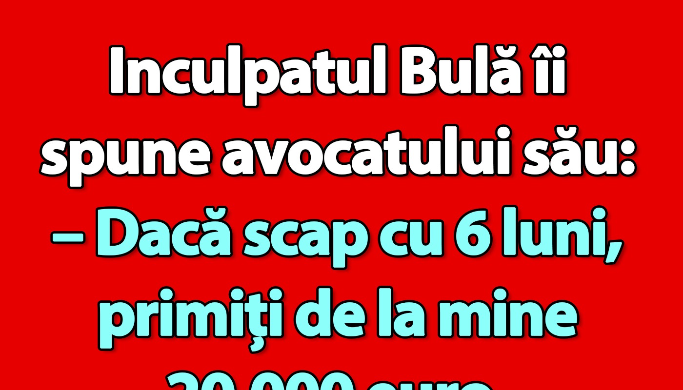 Bancul se desfășoară în jurul unei promisiuni financiare între Bulă, un inculpat, și avocatul său. Acesta din urmă este motivat să își apere clientul nu doar din obligația profesională, ci și din dorința de a câștiga un onorariu considerabil. Această dinamică este comună în multe procese legale, unde banii pot influența, de multe ori, calitatea apărării. În România, un onorariu de 20.000 de euro pentru un avocat nu este neobișnuit, mai ales în cazurile de mare notorietate sau complexitate.