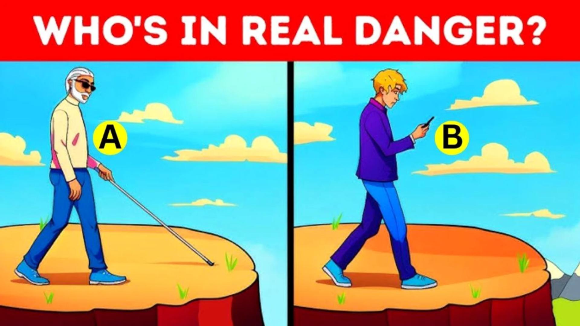 Dacă ai ales tânărul cu telefonul (B), ai dreptate! Deși bărbatul în vârstă este nevăzător, el folosește un baston pentru a se ghida, ceea ce îi permite să detecteze marginea prăpastiei înainte de a fi prea târziu.