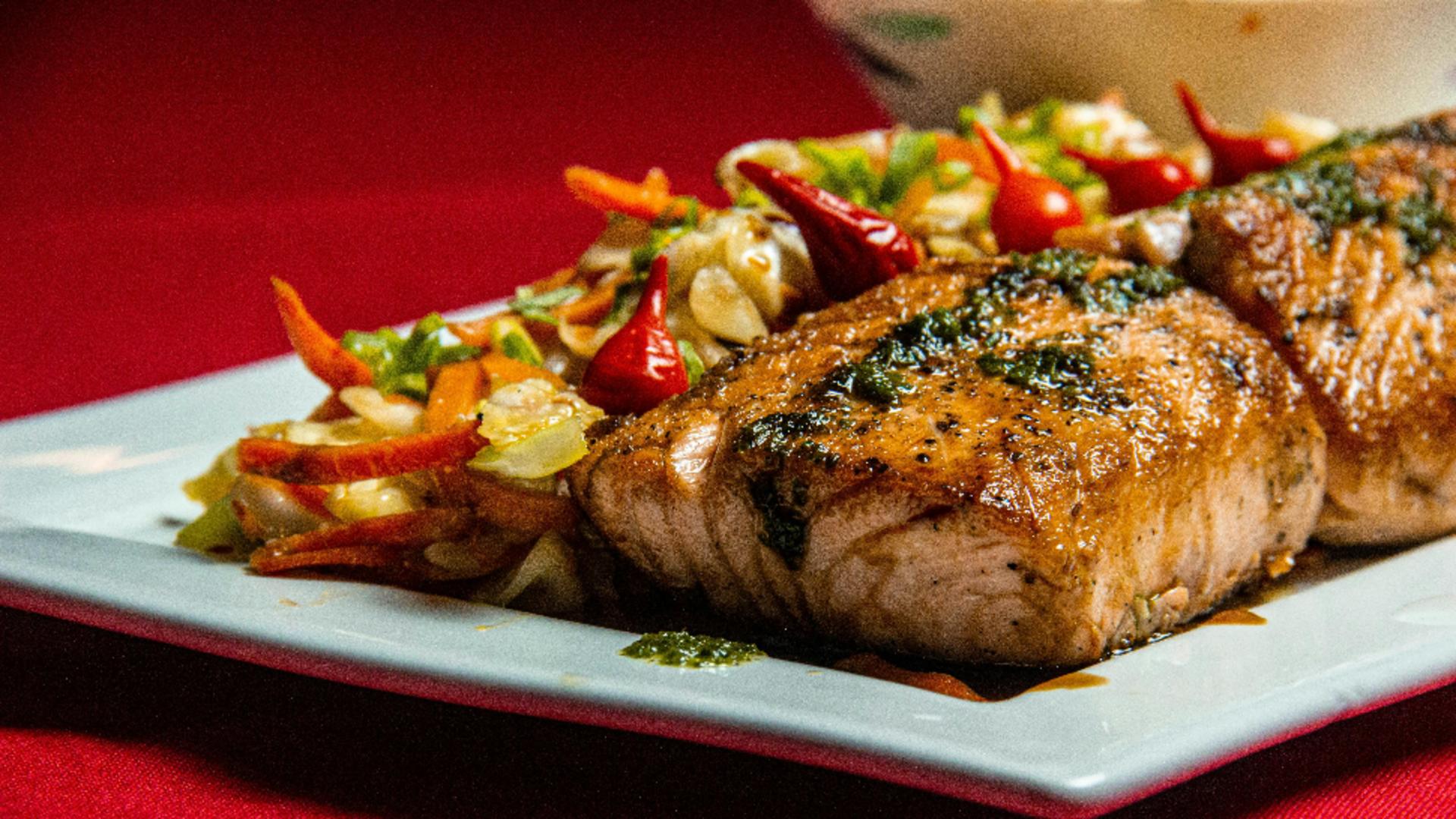Alegerea legumelor proaspete, bine asezonate și gătite alături de pește, creează un preparat armonios și savuros, perfect pentru o masă sofisticată.