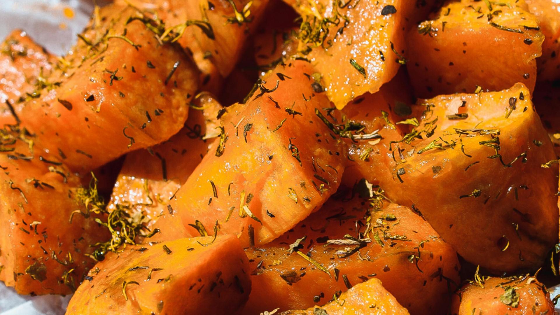 Ingrediente2-3 cartofi dulci mari2 linguri de ulei de măsline2 căței de usturoi, tocați1 linguriță de rozmarin proaspăt tocat1 linguriță de cimbru proaspăt tocatsarepiper după gustPrăjitura cu cafea și zahăr caramelizat. Cel mai bun desert de POSTMod de preparare
