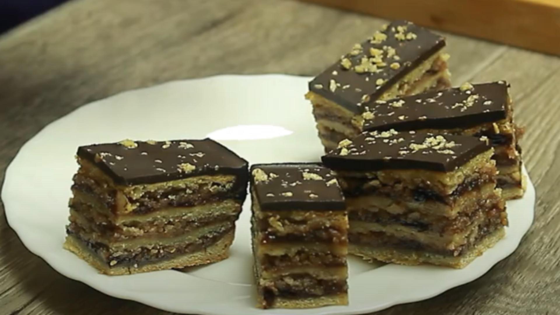 Pune drojdia într-un bol împreună cu zahărul și laptele călduț. Amestecă bine până când se topește zahărul și se dizolvă drojdia.Separat, cerne făina și amestecă  cu sarea.Amestecă gălbenușurile cu untul și untura topite, smântâna, vanilia, iar la final adaugă treptat făina cernută amestecată cu sarea. Trebuie să obții un aluat moale dar care nu se lipește.Acoperă castronul de aluat cu un prosop de bucătărie și-l lasă-l așa timp de aproximativ 15 minute, ca să crească puțin.Aprinde cuptorul la 180 de grade și tapetează o tavă cu hârtie de copt.Pune aluatul pe suprafața de lucru și împarte-l în 4 bucăți egale, apoi întinde fiecare bucată pe suprafața de lucru presărată cu făină. Ai grijă să o presezi cu mâna ca să aibă aceeași grosime peste tot și apoi, întinde-o bine cu un sucitor ca să încapă în tavă.Pune bucata de aluat în tavă, înțepând-o din loc în loc cu furculița și apoi unge-o cu gem și presară o treime din nuca măcinată amestecată cu 100 grame de zahăr.Procedează la fel și cu cealalte foi, punându-le una peste alta în tavă. Ultima foaie nu o mai ungi, doar o înțepi din loc în loc.Lasă aluatul așa să dospească la loc cald timp de 15 minute, apoi pune tava la cuptor pentru aproximativ o oră. Pentru a vedea dacă prăjitura este gata, fă testul cu scobitoarea și, apoi scoate-o din cuptor.Fă glazura astfel: fierbe apa cu zahărul până când acesta se topește, apoi adaugă pudra de cacao și untul. Continuă să fierbi până când se leagă totul.Las-o la răcit câteva ore sau până a doua zi, iar când s-a răcit de tot toarnă peste ea glazura făcută din ciocolată. Când glazura este întărită, o poți servi. Rețetă de gogoși turcești. Un deliciu crocant, însiropat și pe gustul iubitorilor de dulciuri